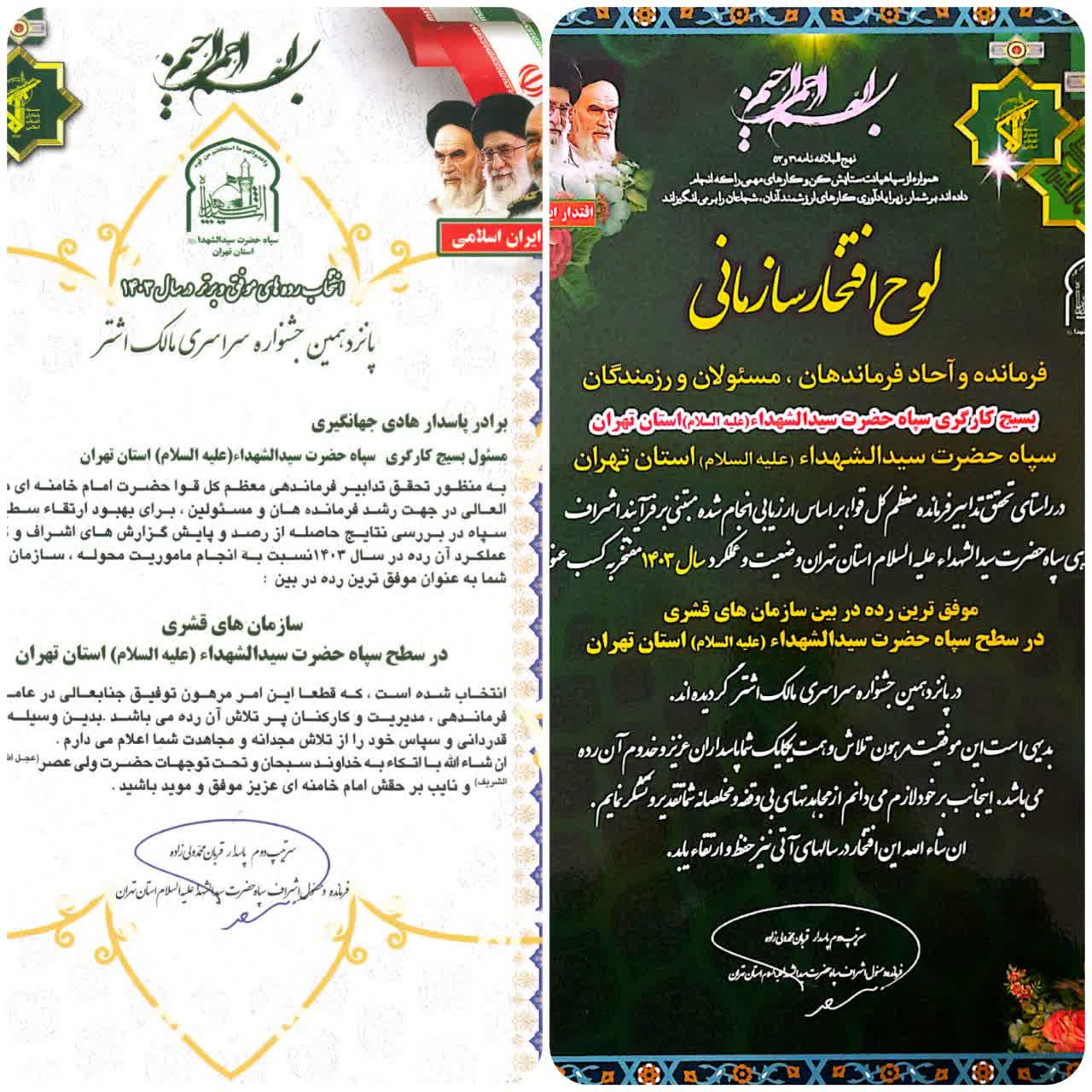 به گزارش جایگاه خبر، با افتخار و سربلندی اعلام میشود که سازمان بسیج کارگران و کارخانجات سپاه حضرت سیدالشهدا (ع) استان تهران، درخششی چشمگیر و افتخاری بزرگ را در پانزدهمین جشنواره سراسری مالک اشتر رقم زد.